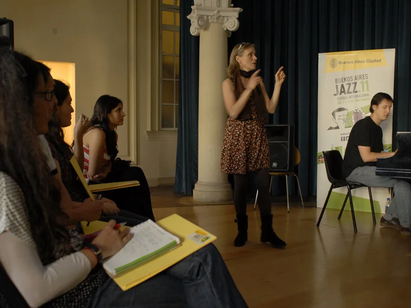 In demand as a visiting artist and clinician, Eade has taught masterclasses from MIT and Harvard to Buenos Aires and Latvia. She is a regular faculty member at Interplay Jazz Camp and Samba Meets Jazz, and has taught frequently at the California Jazz Conservatory. Eade has worked with vocal groups, instrumental ensembles, and individuals in myriad settings on subjects ranging from ear training, theory and technique, to interpretation and improvisation.
